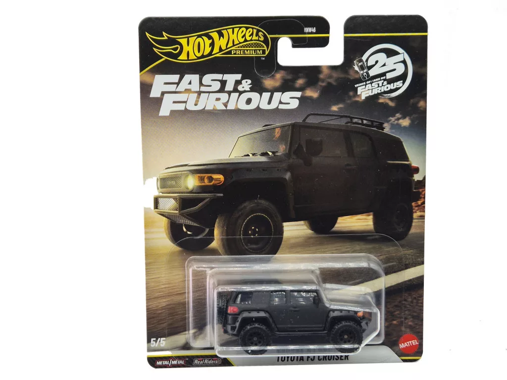 The Hot Wheels Premium – Fast & Furious – Toyota FJ Cruiser brings one of the distinctive off-road vehicles from the Fast & Furious franchise into 1:64 collector-grade form. Its metal body and Real Riders rubber wheels give the model a true premium feel. The retro-inspired yet modern FJ Cruiser is a real favourite among both off-road fans and Hot Wheels collectors.